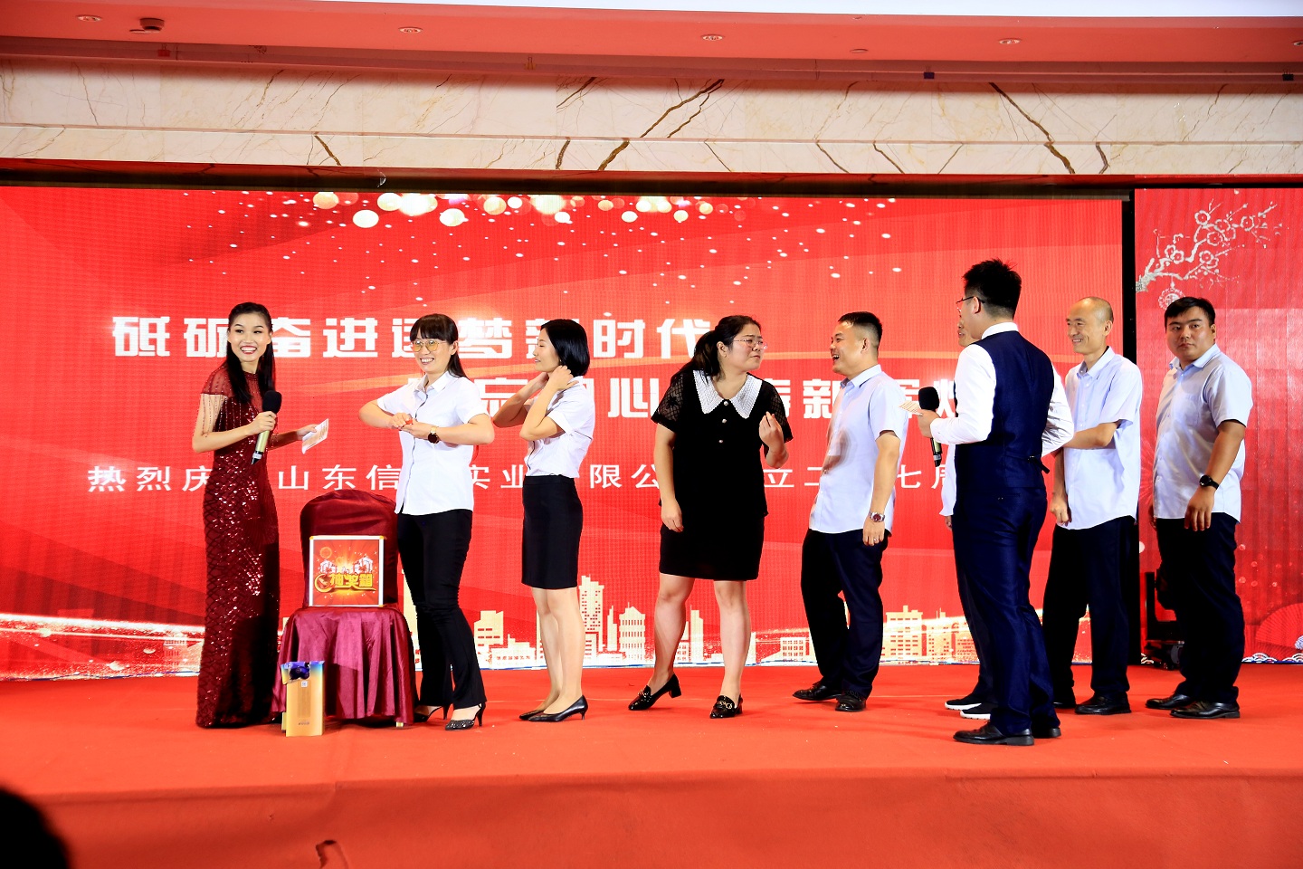 此次慶典晚宴參加人員除了信橋全體員工之外,還有部分老領(lǐng)導(dǎo)和老朋友,大家共同分享了信橋二十七周年的喜悅與精彩。八號(hào)上午,慶典開始之前,演員們辛勤排練,燈光師、音響師共同配合,所有人為了晚會(huì)都在努力。下午4點(diǎn)58分,晚會(huì)正式開始,全體員工與領(lǐng)導(dǎo)集體合影,信橋隊(duì)伍不斷在擴(kuò)大。今年的晚會(huì)添加新的互動(dòng)方式,采用了直播和紅包雨的新形式,是信橋周年慶典的一次新的嘗試。